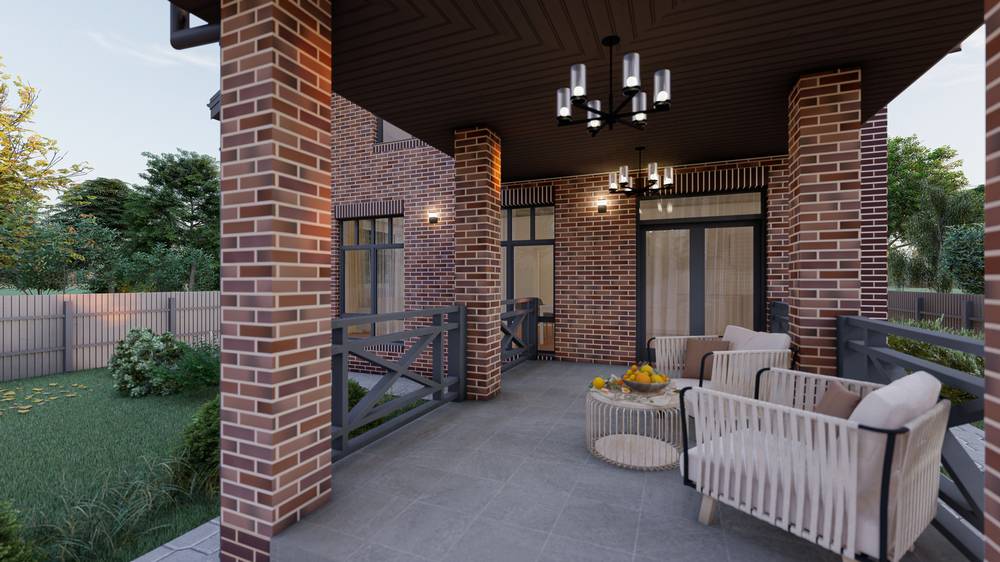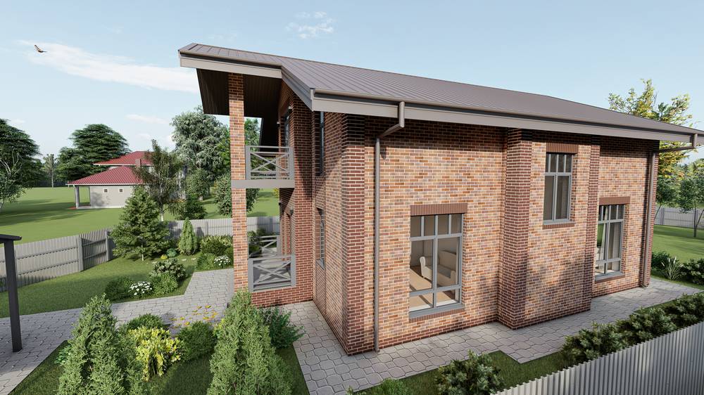 Фасад дома выполнен в темных тонах облицовочного кирпича, сразу привлекают внимание большие окна, наполняющие пространству внутри светом.