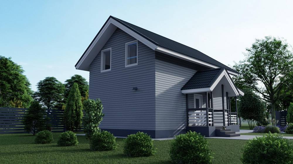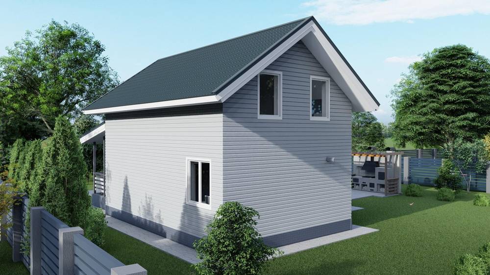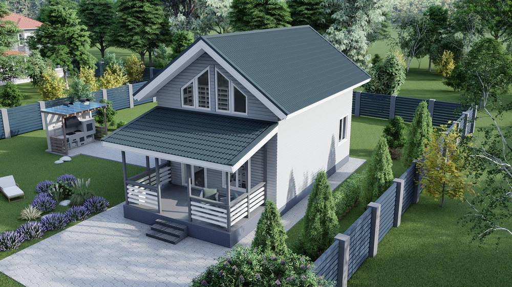 На первом этаже размещена кухня-гостиная с выходом на террасу, заведенную под крышу, а также спальня, санузел и тамбур.