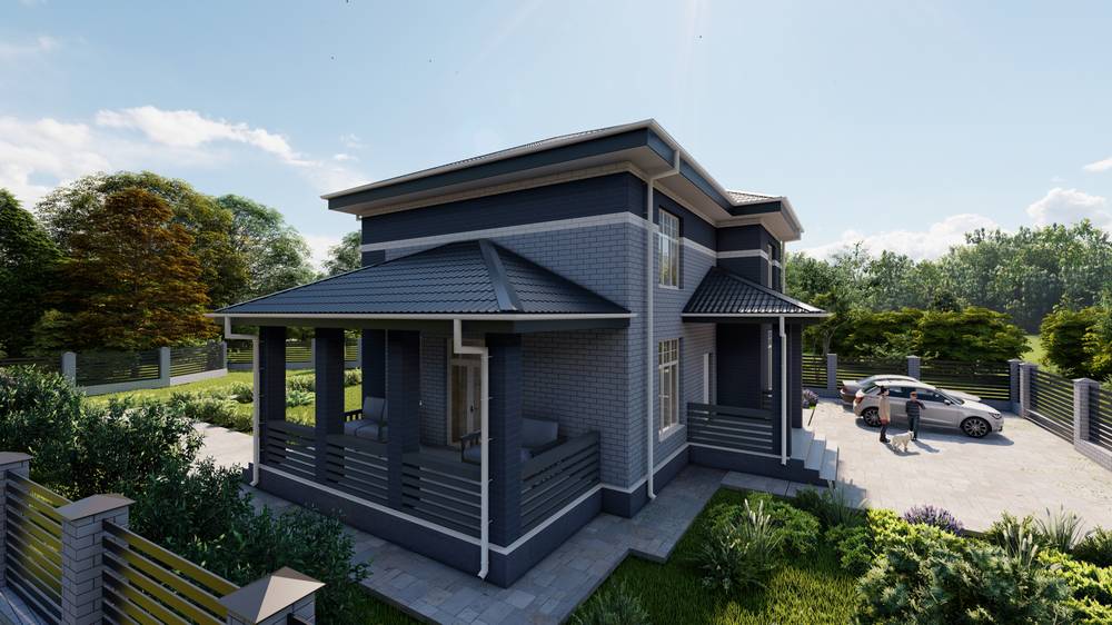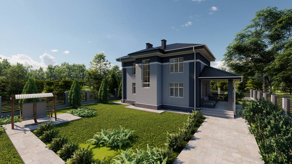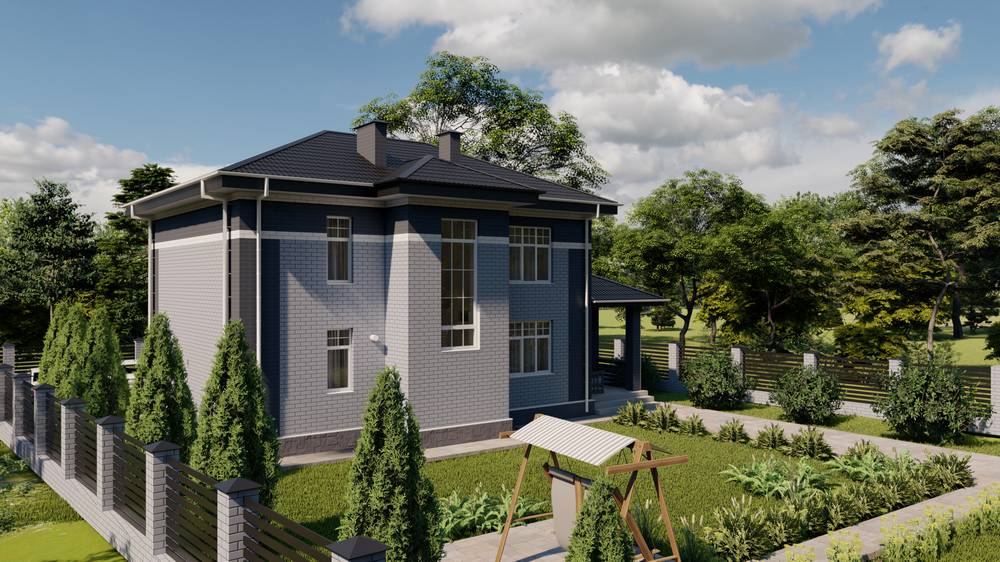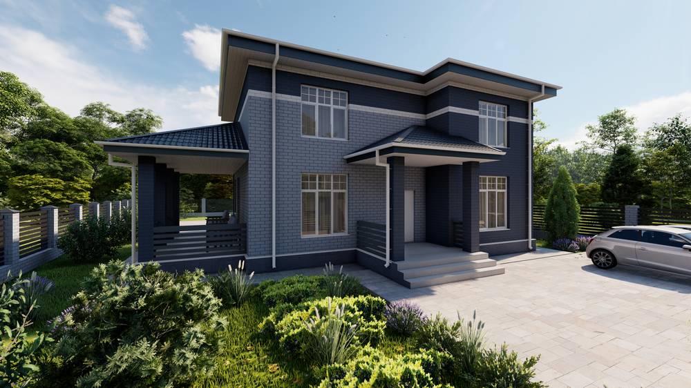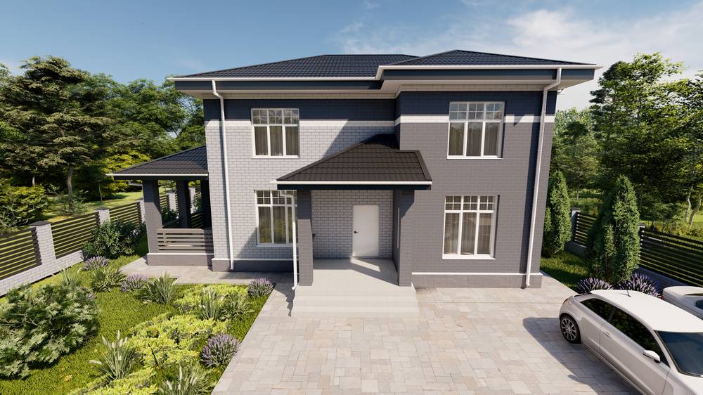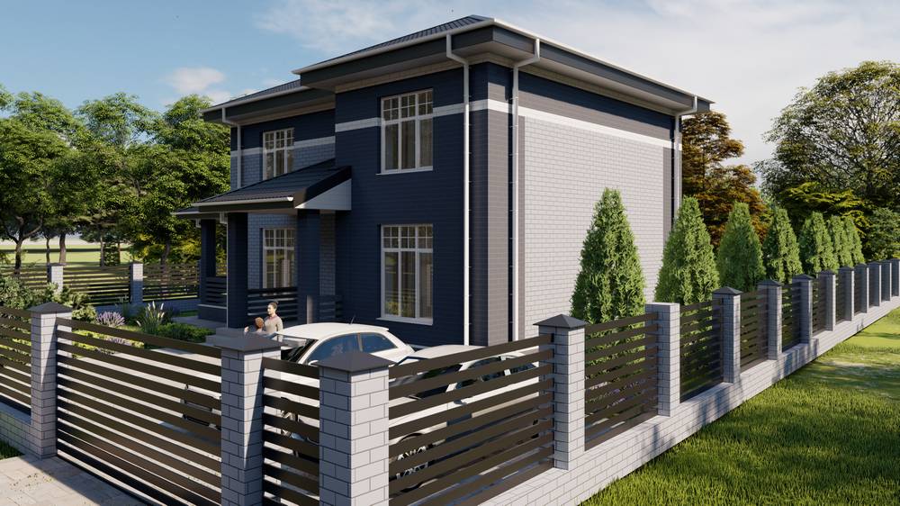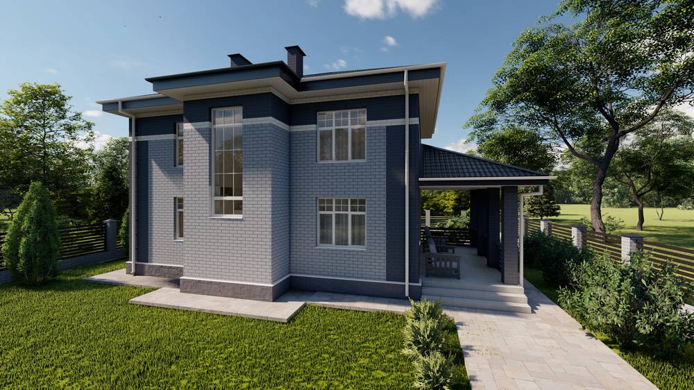 Классический двухэтажный дом с маленьким углом наклона крыши, нестандартная облицовка придает дому европейский шарм и не останется незамеченным.