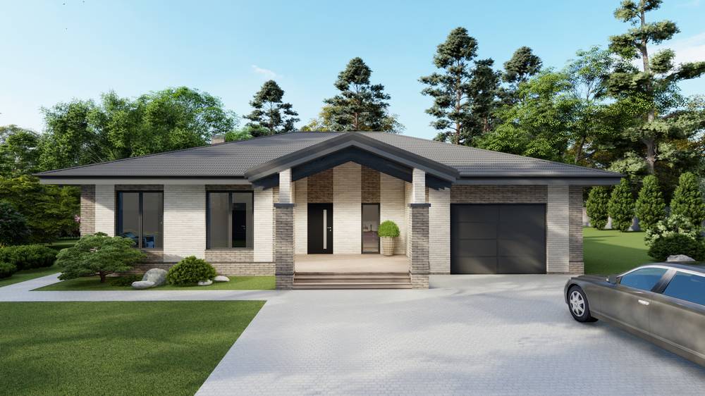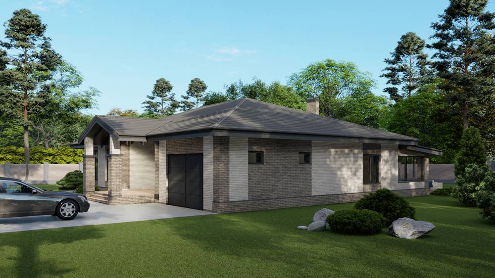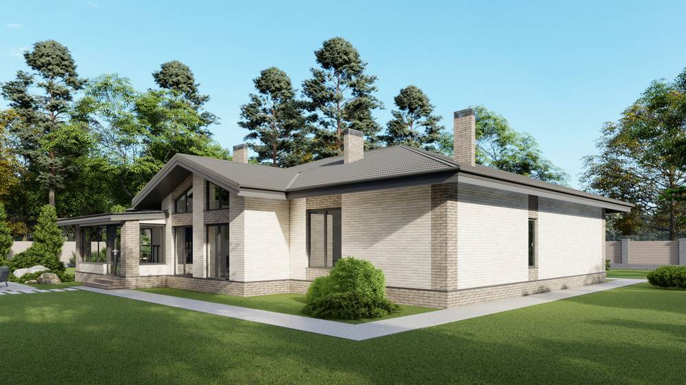 Фасад облицован двумя видами кирпича. В доме увеличенные окна, что добавляет естественного света в помещения.