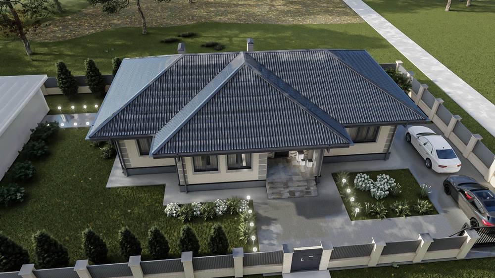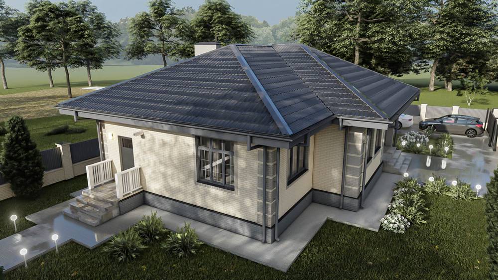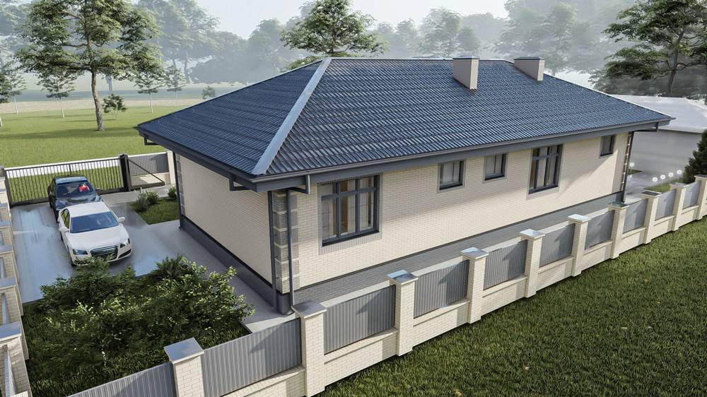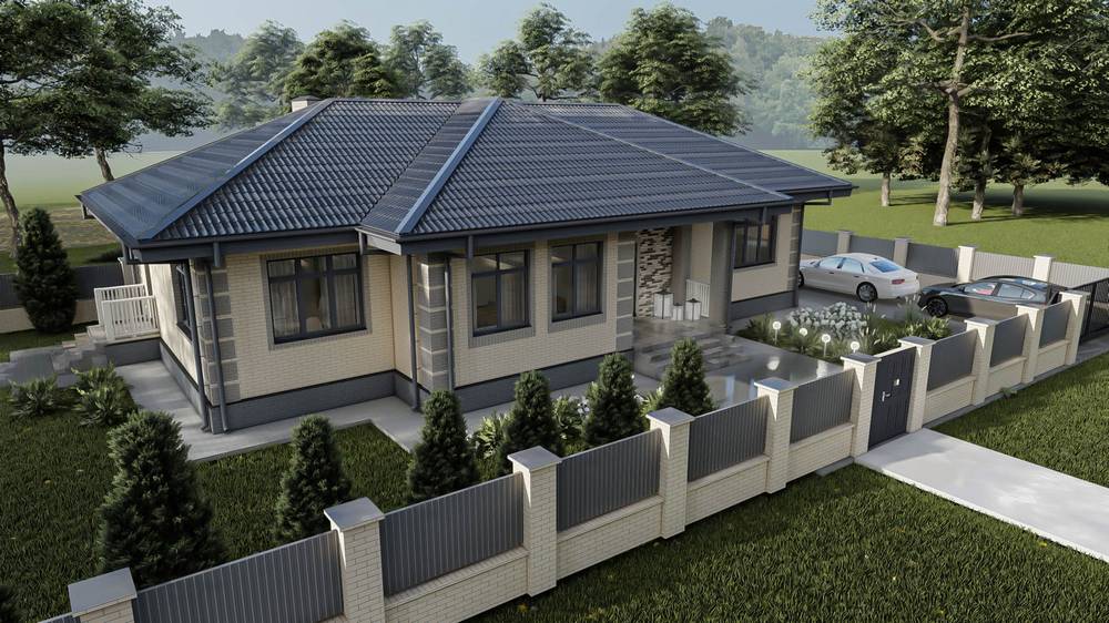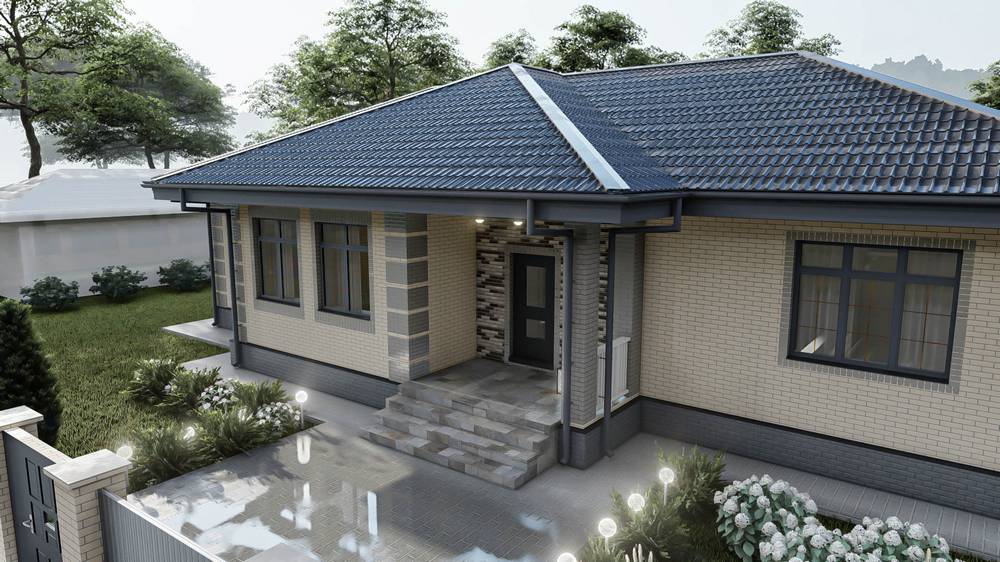 Стильный одноэтажный дом выполнен в светлых оттенках — молочный и серый. Коттедж прямоугольной формы с выступающей входной группой, оформленной облицовочным кирпичом ручной работы. Акценты на окнах расставлены декоративным кирпичом.