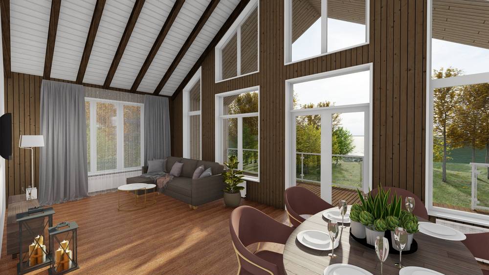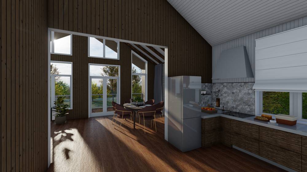 Дом построен по каркасной технологии. Главными преимуществами стиля барнхаус являются: