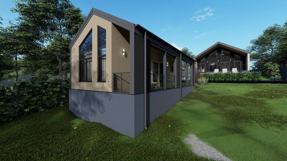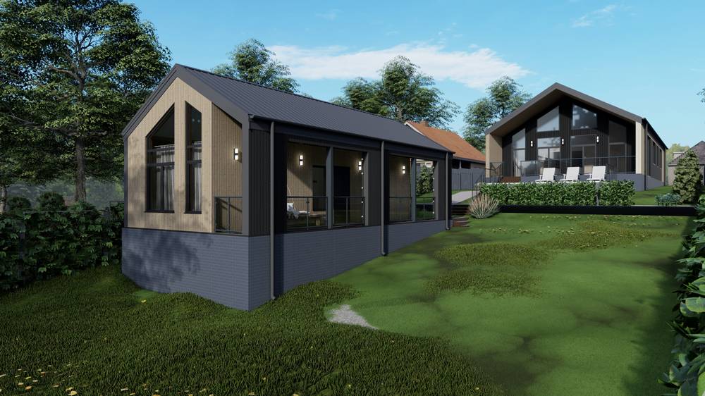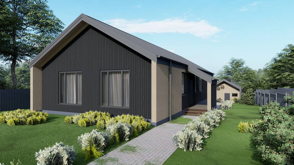 Общая толщина стен, включая внутренние и внешние облицовочные материалы 250 мм. Внутренняя облицовка – ГКЛ и имитация бруса. Наружная отделка: Металлический сайдинг ELBRUS в цвете RAL 7024, Фасадная панель Ю-Пласт Хокла Лиственница Медовая.