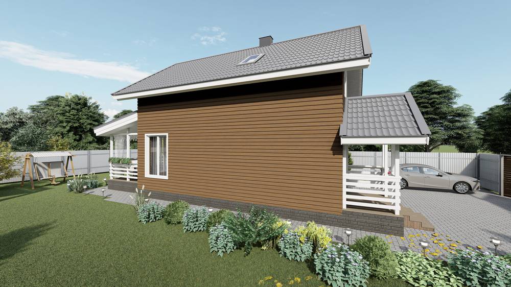 Общая толщина стен, включая внутренние и внешние облицовочные материалы 250 мм. Внутренняя облицовка – ГКЛ и имитация бруса. Наружная отделка: стены — сайдинг «Ю-ПЛАСТ» цвет Тимберблок Ель Сибирская, отделка цоколя — фасадные панели Ю-пласт Стоун Хаус Кирпич цвет графит.